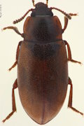 | 1 | Fühler länger, die der Männchen bis oder fast bis zum Hinterrand des Halsschilds reichend, die der Weibchen ungefähr die Mitte erreichend. Schienen, vor allem die Vorder- und Mittelschienen zur Spitze hin deutlich erweitert, dort bei den Männchen 3-4 mal, bei den Weibchen doppelt so breit wie an der Basis. Vordertarsen des Männchen stark erweitert. Punktierung des Halsschild an den Seiten dicht, auf der Scheibe spärlicher werdend, dort die Punktabstände ungefähr doppelt so groß wie die Punktdurchmesser. Punkte der Flügeldecken von der Basis zur Spitze kleiner werdend, dort weniger als halb so groß. Körper einfarbig braun bis schwarz. Etwas größer, 4,75-5,25 mm(*). Ganz Japan; weit verbreitet in Ostasien. In Japan häufig unter angespültem Tang an Sandküsten. (=algae ) → Micropedinus pullulus , ホソハマベゴミムシダマシ (*) Meine Exemplare sind deutlich kleiner als in dem von Lewis angegebenen Rahmen. Alle anderen Merkmal sprechen aber eindeutig für pullulus. |