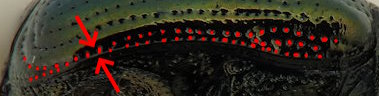 4 | Der 9. Punktstreifen der Flügeldecken verbindet sich über dem 1. Abdominalsegment mit dem 10. Punktstreifen. Augen getrennt, oder höchstens bei dem ♂ in einem Punkt in der Mitte berührend. Mittelschienen nicht blattartig erweitert, Vorder- und Mittelschienen mit Mukro. Meist matt grün oder dunkelblau. 3,8-4,2 mm. Von Reynoutria sachalinensis und Acer sp. gemeldet. Alle Hauptinseln, Oki, Okushiri-to, Ostrussland, Korea. → Euops punctatostriatus , ルリオトシブミ Bemerkung: Meine Exemplare haben alle einen zusätzlichen kurzen Punktstreifen zwischen dem 9. und dem 10., der nicht über die Hinterbrust hinausreicht. So wie ich Morimoto verstehe, ist dieser nicht gemeint. Bei punctatostriatus gibt es also drei Streifen an den Seiten der Flügeldecken - der mittlere (Zwischenstreifen) endet noch über der Hinterbrust, und kurz dahinter mündet der äußere (10.) in den inneren (9.). |