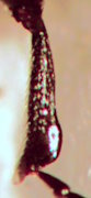1 | Flügeldecken tuberkuliert, unregelmäßig punktiert-gestreift. Kopf länglich, hinter den Augen etwas eingeschnürt. Vorderschienen der ♂ länglich und gebogen. Schwarz, meist mit braunem Schimmer. 4,0-4,3 mm. Auf Acer palmatum. Honshu, Shikoku, Kyushu, Tsushima. → Euops pustulosus , コブルリオトシブミ |